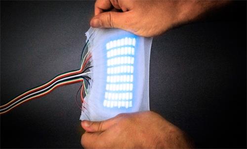 康奈尔大学的研究人员研究出了一种特殊的“皮肤”,这是一种可发光的材料,柔软性极强,可以拉伸至六倍以上并且保持发光。这种“皮肤”由两层透明的导电水凝胶构成,两层水凝胶之间是一排电容器,它们在通电时会发光。