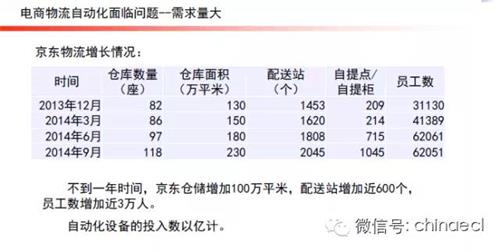 第二点,我觉得电商的物流市场是很大的一个市场,这是有数据支撑的。根据我们的经验,一万平米仓库大概能支持八个亿的销售。按照目前的增长速度,每年电商行业要新增一千万平米仓库。在座的招商部门和物流自动化设备厂商肯定很高兴。我们可以算一下,举几个简单例子,比如说叉车,光我们电商物流行业一年新增至少一万辆叉车,就拿京东来说,每年至少要采购几百辆叉车,我们只是其中一家。再看输送机,保守估计每年需要增加五百公里。