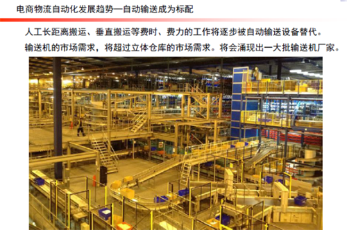 输送设备将会成为标配。现在电商行业低于两万平米的单体仓库很少,都比较大,我们大的电商企业在建的基本上都是单体五万平米以上的,或者是说一个园区,十万,二十万,四十万平米来建,所以这个输送设备不得不用。