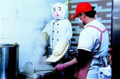 在该校阳光校区二食堂,记者看到一个很特别的“师傅”。这个“师傅”并非真人,而是一个机器人。店主将其打扮成“喜洋洋”模样,它正左手托面左右匀速运动,右手持刀片上下摆动削面,一根根面条准确地飞进热腾的锅中,不到20秒,一碗刀削面便削好了。