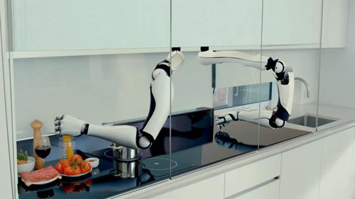 同时,这套Moley系统中的机械手臂内置触觉传感器,通过模仿可以完成切、搅拌、倒等动作,并且能够操搅拌机和收放餐具。而那些打开燃气灶、关闭吸油烟机等简单的操作更是不在话下。此外,Moley系统还配备了集成触摸屏以及移动设备端App,用户可以通过这些方式来整体操控这个智能厨房系统。
