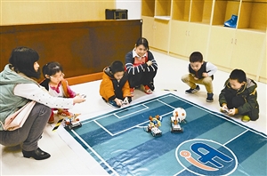 活动设有机器人科普知识讲解、机器人手工及机器人比赛等环节。老师根据年龄将小朋友分成3组,组装不同难度级别的机器人。在共同合作下,小朋友将一个个机器人组装好,展示在大家面前。看着自己亲手组装的机器人变身打印机打印出一张张小纸片、有的机器人在遥控下灵活踢球时,小朋友满脸洋溢着兴奋的表情。