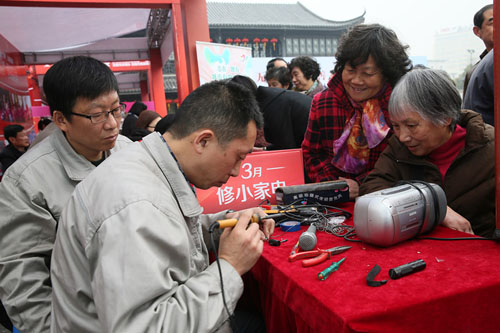 3月3日上午,无锡市启动崇德乐善“一月一主题”3月“学习雷锋”榜样月活动暨第四届志愿者活动月活动,锡柴组织了机械精修志愿小分队参加了活动,为市民修理收音机、麦克风、榨汁机等小家电(如图)。3月5日,锡柴的志愿者们放弃周六休息时间,前往广益养老中心,为孤寡老人送上了各种水果等慰问品;志愿者们还来到南禅寺地铁站如站口,帮乘客们提行李、搀扶老人上下楼梯;组织志愿者赴惠山国家森林公园,收集塑料袋等垃圾,树立锡柴人良好的环保理念。