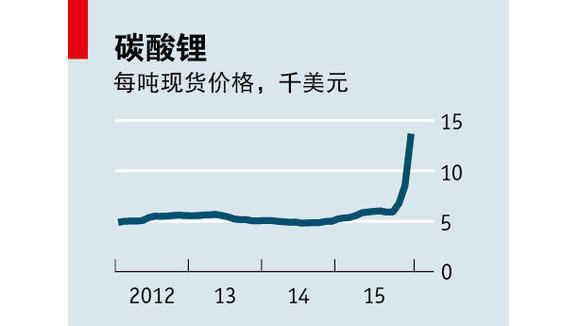 锂离子电池正日益离开人们的口袋,应用于电动工具、汽车、住宅乃至发电站。美国、中国和日本的汽车制造商正争相确保获得足够多的锂供应,为更电动化的未来做准备。争夺如此激烈,令这种在每块电池中少量使用的金属如今成为了世界上少数走俏的大宗商品之一。2015年最后两个月里,中国进口的碳酸锂价格增长了一倍多。