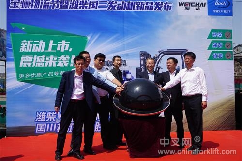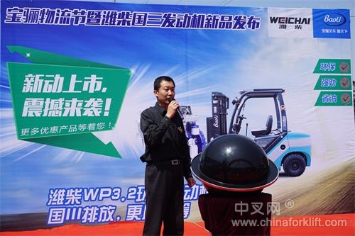 随后,凯傲宝骊(江苏)有限公司总经理王桂海先生、潍柴动力工程机械有限公司总经理张超、潍柴动力工程机械有限公司副总经理刘伟、济南现代物流协会秘书长贾伟及济南厦基重工机械有限公司熊桂林先生、山东重诺电动叉车有限公司王国旗先生,共同上台为“宝骊物流节”的开幕进行揭幕,蓝色水晶球的亮起,揭开了“宝骊物流节暨潍柴国三发动机新品发布会”由济南开始踏上征程,为期2个月,途径全国40个物流园区,首站济南的活动,将为期四天,4月份的物流节将在14个物流园区中举行。