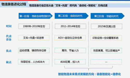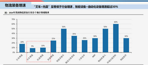 在智能物流装备所有的子版块中,叉车和托盘的增速大约在10%左右,低于行业平均增速10个百分点。其他智能化设备,包括智能穿梭车、立体仓库、AGV、物流机器人、拣选系统、软件等,增速都在30%以上。