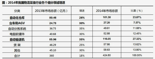 对物流装备行业进行分解后发现,自动化仓库占物流装备的比重达到了24%,自动输送机的占比达到27%,货架是14%,分拣设备和软件均为12%左右。在设备中,AGV虽然只是占比比较小的输送装备,但是却是智能化非常关键部件,增速仍然较高。