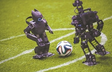 2016年机器人世界杯中国赛在合肥举行。本次比赛共设置赛项16大项,吸引了来自全国各地的近300支队伍、近2000人参赛。图为四川大学的机器人(左)和东南大学的机器人在类人组比赛中。