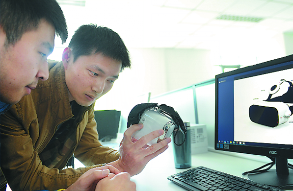 4月24日,技术人员正在对新一代虚拟现实一体机进行调试。该一体机由安徽协创独立研发,使用者可以通过声控和身体语言操作产品,全方位直观地感受3D影视与游戏。记者杨竹摄