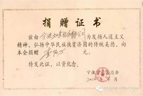 近日,宁波如意股份有限公司向市慈善总会捐款100万元,至此,“吉旺慈善帮困基金”增加到1300万元。储吉旺说,他把企业比作一棵树,职工是一条根,树没有根的话,树不能成长;而有根没有树,这个根也不会存在,所以企业和员工的关系,是树同根的关系。这是我们对社会的一种反哺,一种感恩。据统计,至今储吉旺和公司累计向慈善公益事业捐款1.2亿元。