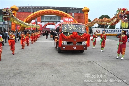 此后,由出席本次仪式的韩国忠州市长赵吉衡、韩国忠州市议会议长尹范老、大韩民国驻武汉总领事郑载男、SMC株式会社社会金光寿、松滋市市长伍昌军、湖北先行汽车有限公司董事长肖顺美共同按下蓝色水晶球,并由湖北经信委机械材料处任处长宣布先行新品下线。车间帘布缓缓打开,两队舞狮护送新品向嘉宾开来,沿着红地毯驶出厂区外进行街游,让世人一睹先行专用多功能车载式作业车的新品及新技术。