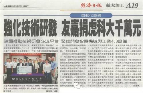 友嘉实业集团总裁朱志洋先生因相当重视人才培训与产学合作,故于2015年开始与虎尾科大合作办理友嘉实业集团国际先进装备制造产业学院,共同培养工具机产业专职人才,执行至今已共有近50名学生加入产业学院;其中20名大四学生现已进入友嘉实业集团台湾各公司进行实习,5名学生赴友嘉集团德国工厂实习,未来学生们毕业均将留任于友嘉集团。