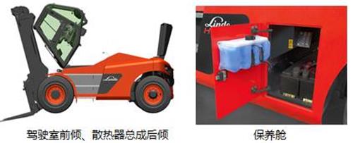 林德驾驶室可整体向车体前方倾斜;防冻液、液压油、空气散热器总成可整体车体后方开启;滤芯、玻璃水容器、电气保险、电瓶、电源总开关等集中在车体右侧同一位置。这样独特的设计方案,使得维护、保养变得更方便、轻松,节省了空间,提高了效率。
