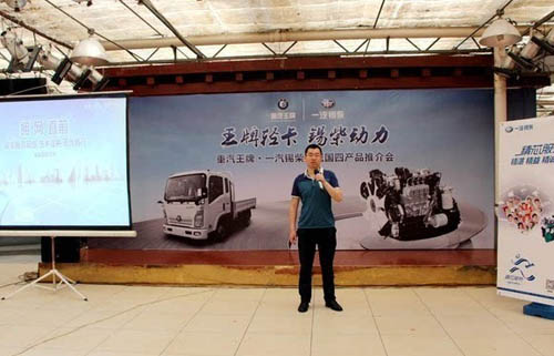一汽锡柴销售公司京津冀事业部品牌经理束嘉超先生致辞,他详细介绍了一汽锡柴康威国四发动机产品,对发动机性能、设计亮点、高可靠性和低使用成本做了详尽分析,并对锡柴全国密集的服务、配件网络作了讲解。