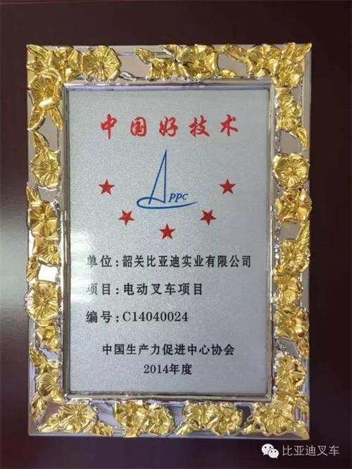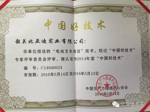 “中国好技术”评选活动由中国生产力促进中心协会于2014年启动,活动以全国2599个各级生产力促进中心为开展单位,目的是把蕴藏在民间的好技术变成好产品,把好产品推向国内外市场,让中国的好产品变成中国的好品牌,让中国的好品牌产生巨大的经济效益和社会效益。同时,这项活动也是为深入贯彻落实党中央、国务院关于实施创新驱动发展战略和“大众创业、万众创新”的精神,加快发展科技服务业,实现创新创业创富的中国梦而开展的。2014年度“中国好技术”评选活动全国共征集科技创新产品和可产业化技术成果近千项,经过40多位国内外知名专家两轮严格评审,最终遴选出154项先进实用、贴近民生的“中国好技术”成果。比亚迪叉车项目凭借着先进的技术优势,被认定为2014年度“中国好技术”。