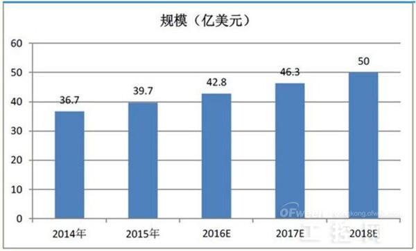 2014年全球机器视觉规模持续走高,达到36.7亿美元。主要分布在北美、德国、英国、日本、中国等地区和国家,其中中国占到8.1%;预计到2018年全球市场规模将达到50亿美元。