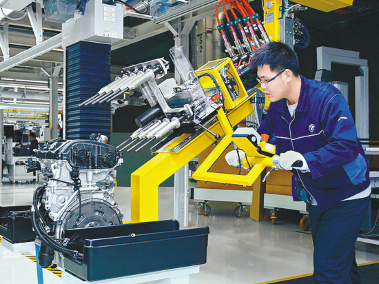 图为工作人员在宝马发动机新厂总装车间组装发动机。