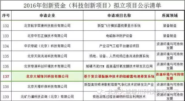 近日,北京大城绿川科技有限公司(DACEEN)基于复合谐振脉冲技术的铅酸蓄电池维护修复系统成功通过市科委专家审核,获得北京市科技型企业促进专项扶持,序号:137,所属领域:资源环境与可持续发展,为行业树立了新的里程碑!