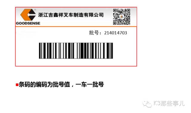 K/3 WISE会根据销售订单生成生产任务单,通过生产任务单可以解析出产品的批号特性,批号属性包括了(发动机、门架、颜色、变速箱 、属具、多路阀、货叉、轮胎、座椅、其它配置)。当叉车完成生产以后,会根据生产任务单打印出整车的车号的条码,条码界面含有叉车批号特性。在出入库的时候,仓管人员会扫描整车条码,并且匹配销售订单,有效的实现了产品的出入库和销售订单一致。