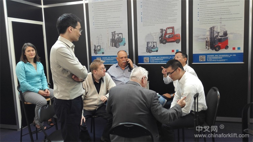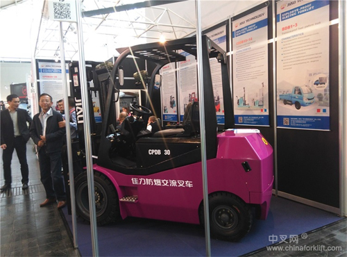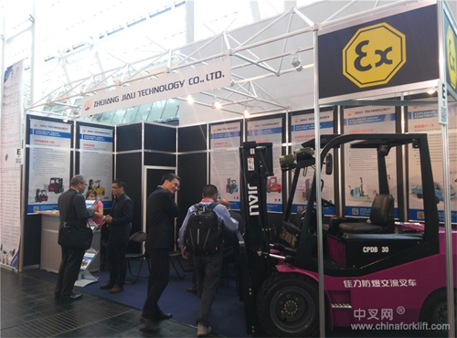 本次参展的佳力CPDB20-35 电动防爆叉车,已获国家防爆电气产品质量监督检验中心防爆认证,爆炸性气体组别:IIB,温度级别:135˚C (T4)。适合爆炸性气体环境(1、2区)及非导电性粉尘环境(21、22区)使用,如石化、军工、制药、油漆等行业的爆炸性环境的仓库等场所的搬运装卸作业,与内燃防爆叉车相比较,噪音小、污染小更适合于危险场所。在展会上来自 “中国制造”电动防爆叉车受到国外客户的关注,现场很多国外的友人与佳力防爆叉车总经理、总工程师陈勇进行深入的探讨。据陈总介绍CPDB系列防爆叉车是佳力引进德国先进防爆技术而开发的具有国际领先水平的新一代防爆叉车,一经推向市场,受到广泛好评,该车型防爆可靠性高,操纵舒适性高。先后承接省级、市级和区级多项科技创新项目,如浙江省重大科技专项重点项目:CPDYJ20-FB系列电动防爆叉车;杭州市重大科技项目CPDB16-3电动防爆叉车等。公司圆满完成项目任务,通过验收,取得科学技术成果登记证书。