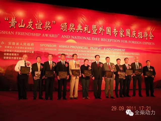 2011年9月29日,安徽省政府在合肥稻香楼宾馆举行2011年“黄山友谊奖”颁奖典礼暨外国专家国庆招待会。时任安徽省委书记张宝顺出席仪式并为获奖专家代表颁奖。“老爱”当天第一个走上领奖台,接过上面刻有迎客松的奖牌,“老爱”特别高兴。活动结束后,自己竖着大拇指对陪同他参加招待宴会的全柴同事说:“我是NO.1”。