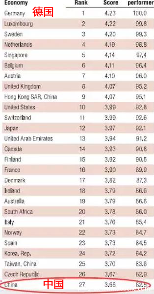 世界银行两年一期的最新版《2016联接以竞争:全球经济中的贸易物流》报告出炉,在其对160个国家的贸易物流绩效进行排名的榜单中,德国连续三届蝉联榜首,叙利亚垫底,中国排名27!
