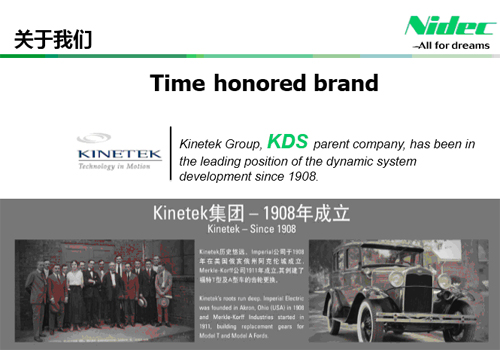 尼得科驱动系统的前身是KINITEK集团,它早在106年就从事电机制造,服务于福特的T型和A型车,百余年来以“专业”为业内所称著。作为全球领先的科技企业,尼得科驱动系统拥有知名品牌Imperial Electric, Advanced Motos & Drives,KDS Drive systems, 在美国、墨西哥和中国的工厂为世界一流客户提供从设计到生产一站式服务方案。尼得科驱动系统致力于为纯电动和混合动力车辆提供完整的驱动系统,产品服务于世界一流品牌,广泛应用在电动运输车辆,物料搬运设备,地板清洗设备,水泵和冷链运输。