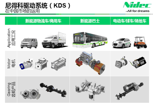 尼得科驱动系统的知名品牌之一KDS,在中国起着举足轻重的作用。KDS着眼全球驱动动力市场,以高品质高标准服务中国市场,产品应用范围非常广,除了服务传统的电动叉车、高尔夫球车行业,也为新能源高速车,电动大巴和微型电动车行业提供驱动系统解决方案,尼得科驱动系统为中国新能源汽车市场注入国际高标准技术实力和一流的产品服务,极大提高了行业的整体水平。新能源汽车是我们的梦想,也是全世界的梦想,ALL FOR DREAMS.