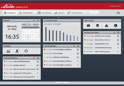 林德车队管理系统(Connected Solutions)就是这样一个软硬兼融的智能化管理平台。安装在每台车辆上的集成模块可收集车辆运行信息,管理人员通过电脑软件汇总车辆信息并进行分析,进行有效管理。