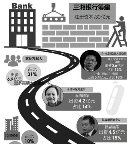 近日,三一重工公告称,银监会同意批复筹建湖南三湘银行,银行类别为民营银行。其中,三一集团有限公司、湖南三一智能控制设备有限公司、湖南汉森制药股份有限公司、湖南省邵东县新仁铝业有限责任公司分别认购该行总股本18%、12%、15%、12%股份的发起人资格。其实,早在2014年12月4日,三一重工、汉森制药、永清环保就发布公告称,联合作为主发起人,筹备设立三湘银行股份有限公司。湖南三湘银行是民营银行常态化设立后第三家获批的银行,在此之前,重庆富民银行、四川希望银行曾先后于5、6月获批。此外,中关村银行、上海张江银行、广州花城银行等民营银行也在积极排队等待入场。
