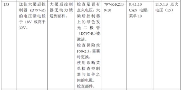 故障代码153:后桥控制器KDU-R电源电压异常,低于18V或高于32V;
