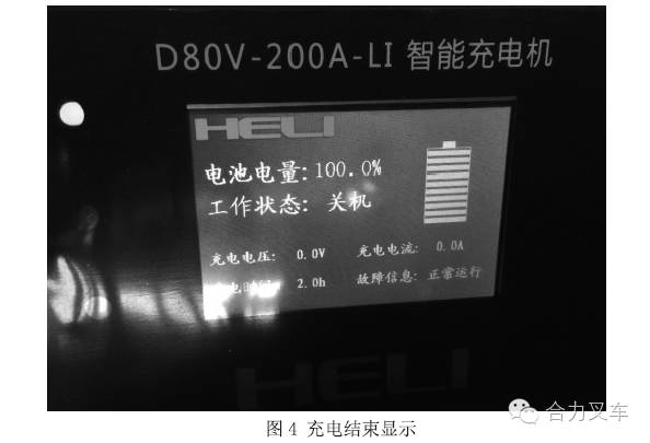 当铿电池充满电后,充电设备会自动停止充电,仪表上输出电压、输出电流均为0,如图4所示。此时按下暂停按钮,之后拔掉充电枪头即可,如图5所示。若锂电池在尚未充满的情况下需要停止充电,需先按下停止按钮,待充电电流降为0(A)后,方可拔掉充电枪头。