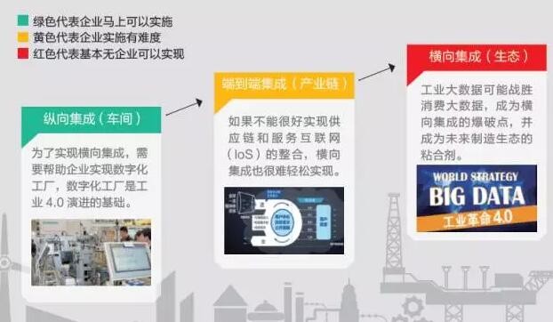 工业4.0将无处不在的传感器、嵌入式终端系统、智能控制系统、通信设施通过CPS形成一个智能网络,使人与人、人与机器、机器与机器以及服务与服务之间能够互联,从而实现横向、纵向和端对端的高度集成,集成是实现工业4.0的重点也是难点。