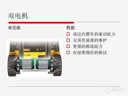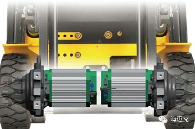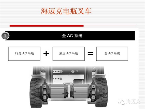 在叉车领域,海迈克革命性地使用了2个交流驱动马达和1个交流液压马达。把电瓶的直流电通过变频技术变为更节能、更利于大比率调速平滑性的三相交流供电。