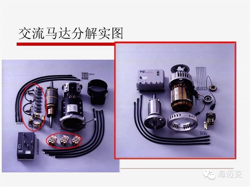 左侧图示传统电瓶叉车使用的直流电机存在着自身能耗大、电枢及碳刷会磨损要不时的更换;而且,直流供电下的整机接触器不能少于5个以上,不仅存在磨损、打火等现象,频繁的更换还造成了大量用于触点的贵金属浪费!而右侧的海迈克叉车则作了大量的优化。