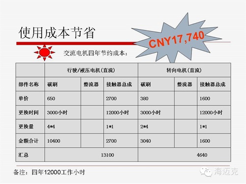 看过这张图表,你会知道海迈克电瓶叉车仅在使用交流电机这一项目上就能为您节剩多少费用。
