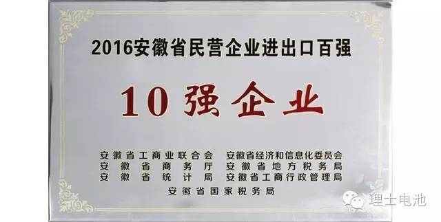 在本次排序活动中,安徽理士分别位列安徽省进出口百强第10名、民营企业营收百强第49名,被授予“2016安徽省民营企业进出口创汇十强企业”、“2016安徽省民营企业营收百强企业”荣誉称号。