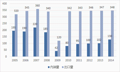 2005-2014年日本工业机器人内销及出口结构变化情况