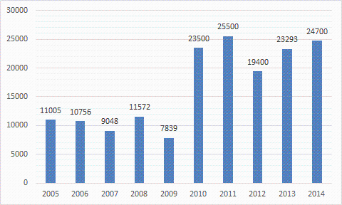 2005-2014年韩国工业机器人市场规模变化情况