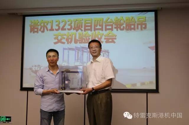 图为特雷克斯诺尔中国总经理向北仑第三集装箱有限公司总经理任小波先生赠送特雷克斯RTG模型