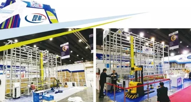9月19日,曼谷天气晴转大雨,距离泰国国际物流展21日正式开展还有两天。由于曼谷展会中心之前的展会在18日晚上才完成拆展,致使昆船参展堆垛机和AGV只能安排在19日上午到达展馆,给展台搭建的时间极其紧张。