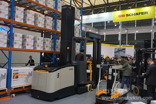 Crown-科朗 TSP 系列特窄巷道人上型三向叉车,主要用于在物流中心或配送中心的仓库内完成货物的存取作业。其特点是货叉可以向前、向左、向右三项旋转,通常在高层货架区的窄通道内进行货物的存取作业。叉车所需的作业空间小,使得仓库的空间能够高效利用,大大提高了存储面积的利用率。