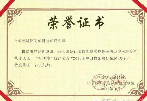 “互联网+物流”的部署推进,促进了物流技术装备市场的大量需求,为了全面提升中国物流装备与技术行业的整体竞争力,促进中国物流装备与技术企业的向高效化、绿色化、智能化的转型升级,践行《中国制造2025》,中国物流品牌网通过“互联网+物流品牌”模式,利用网上供应商投票系统,公正、公平、透明的选出了2016年中国物流技术装备知名品牌。此次海斯特也有幸入围获得“2016年中国物流知名品牌(叉车)”这一殊荣。