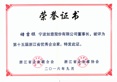 宁波如意股份有限公司董事长储吉旺获评“第十五届浙江省优秀企业家”。 储吉旺凭着艰苦奋斗、勇于创新、敢于人先的创业精神,获此殊荣。他始终坚持改革创新,不断探索,在产品上做到“人无我有,人有我优,人优我智”, 始终走在行业的前端,以其独特的经营理念,成就了如意公司今天的业绩,为如意走向更远奠定基础。