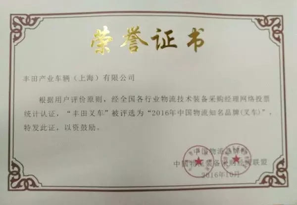 最终,在全国各行业物流技术装备采购经理网络投票统计认证下,丰田叉车被评选为“2016年中国物流知名品牌(叉车)”。