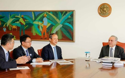 上午10:30,在巴西利亚总统府,特梅尔总统热情迎接王民董事长一行的到来。特梅尔总统高兴地说:这是在中国杭州G20峰会后,与MR.Wang第二次见面了。他说:中国长期将经济增速保持在较高水平,为全球提供了有益经验。本次峰会可以把“中国榜样”带给更多国家,正处于恢复期的巴西经济更需要中国经验。