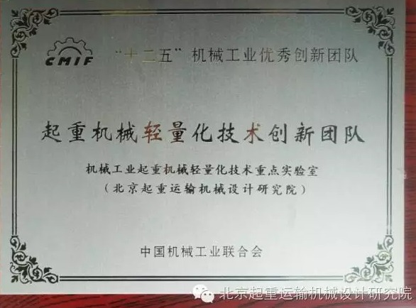 由中国中元副总经理兼总工程师张喜军带领北起院研发中心技术人员组成的“起重机械轻量化技术团队”被评为“机械工业优秀创新团队”。该团队着眼于我国起重机械的绿色发展,采用产学研合作模式,提出项目建议,得到“十二五”国家科技支撑计划立项支持,先后开展了“通用型桥式起重机轻量化设计技术与应用”、“大型起重设备齿轮传动装置轻量化及降噪技术研究”等课题攻关。其科研成果引领了我国起重机械行业绿色制造技术发展,实现了产品绿色化跨越,为智能制造奠定了良好的技术基础,也为我国装备制造业实施节能减排战略与低碳经济发展做出了贡献。目前,该团队正在开展新一轮国家课题,致力于开展桥式起重机轻量化共性技术研究,着力解决轻量化起重机推广应用的瓶颈问题,促进起重机行业的技术进步。