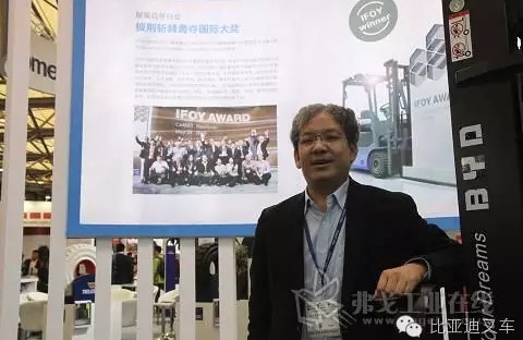 IFOY (International Forklift-Truckof the Year) 国际叉车年度大奖的目标是鉴定和认可全球年度最佳的物料运搬设备以及内部物流解决方案,在国际叉车领域具有至高无上的荣誉。而比亚迪的纯电动叉车ECB18C能过关斩将最终荣获3.5吨以下级平衡重式的年度叉车大奖着实让全球叉车企业为之眼前一亮。“该奖项是对比亚迪叉车这些年为研发纯电动叉车所作出努力的最好评价。”毕总激动的表示:“当时的评选是来自全球多个国家共计25个评审团成员对各参赛产品进行了长达1周的深度测试之后,对驾驶安全性、操控舒适性、动力表现、工作效率、制动性能、转向性能、整车可靠性以及综合能耗等方面进行全面评测后得出的结果。我清楚记得当时一位评委的原话意思说:比亚迪叉车完全不用担心与国际知名品牌的产品进行对比,甚至在节能降耗、操控性能方面还胜过它们。比亚迪新能源叉车不仅在电池方面具有一定优势,在整体性能方面依然可圈可点。”