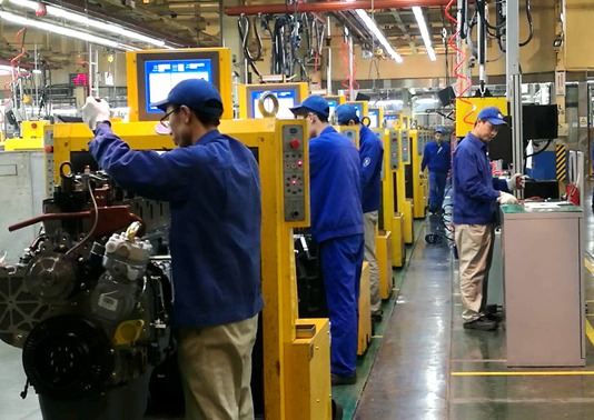 潍柴动力一号工厂总装车间工人们正在组装发动机