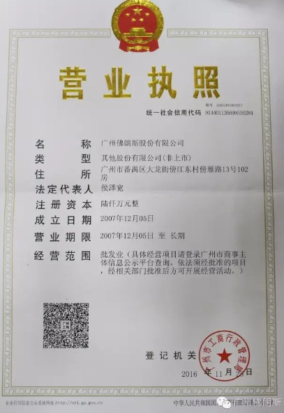2016年11月30日,广州佛朗斯机械有限公司已完成股份改制,正式更名为“广州佛朗斯股份有限公司”,公司的发展由此进入了一个崭新的阶段。